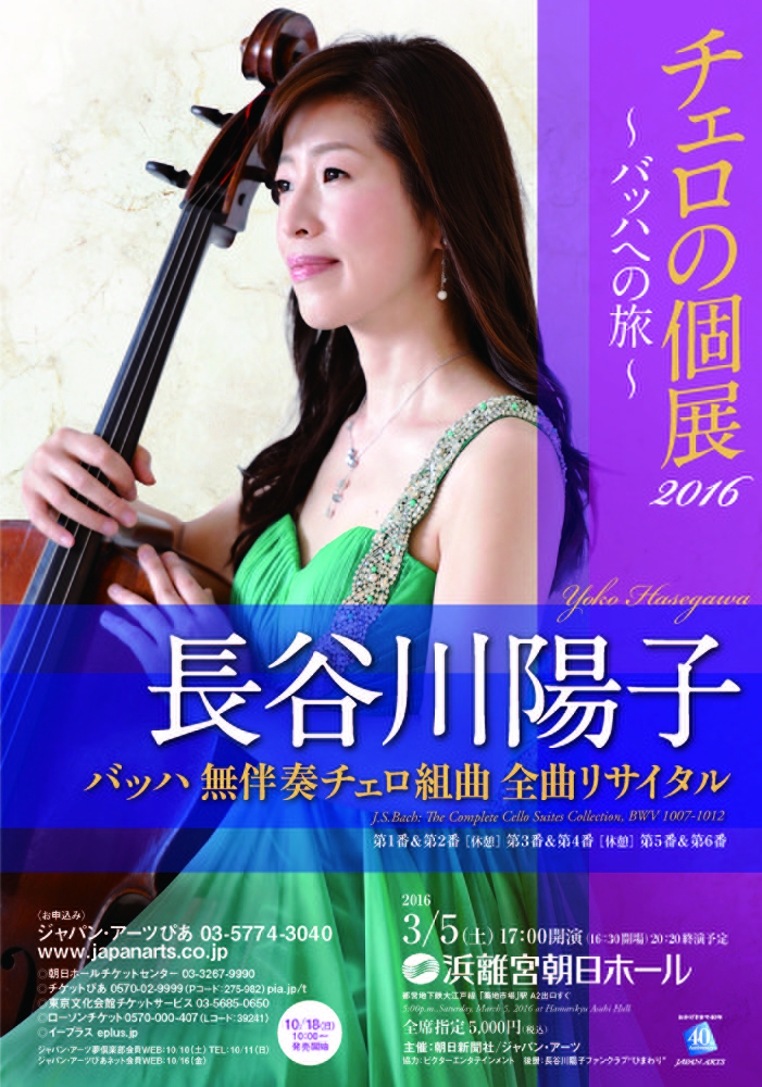 2016年3月5日浜離宮朝日ホールにて行われる長谷川陽子「チェロの個展2016~バッハへの旅」公演情報アップしました。旧約聖書全6曲を一晩で全曲演奏に挑みます。