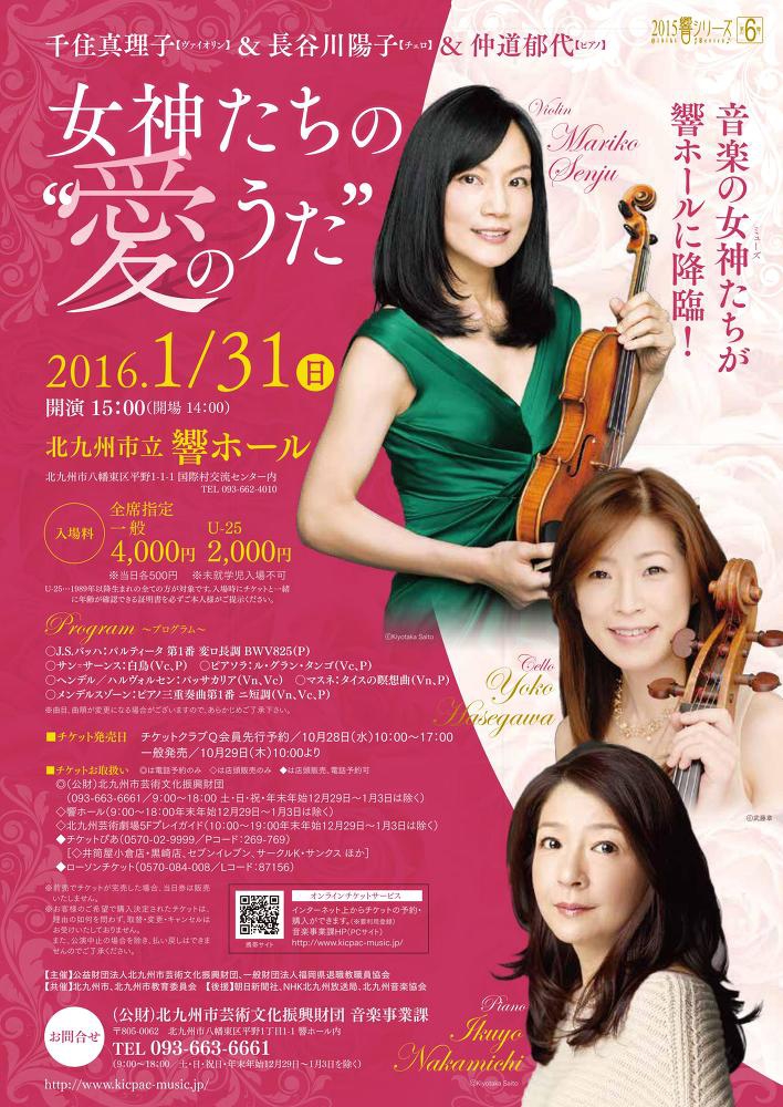 ご好評いただいている千住真理子氏、仲道郁代氏との女神トリオ、3月12日(土)と13日(日)の2日間連続公演です。