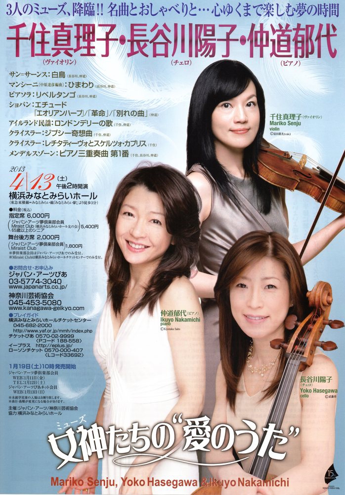 今まで全国各地で行われてきた千住真理子・長谷川陽子・仲道郁代による“女神たちの愛のうた”ですが、いよいよ4月13日には横浜でも実現されます。