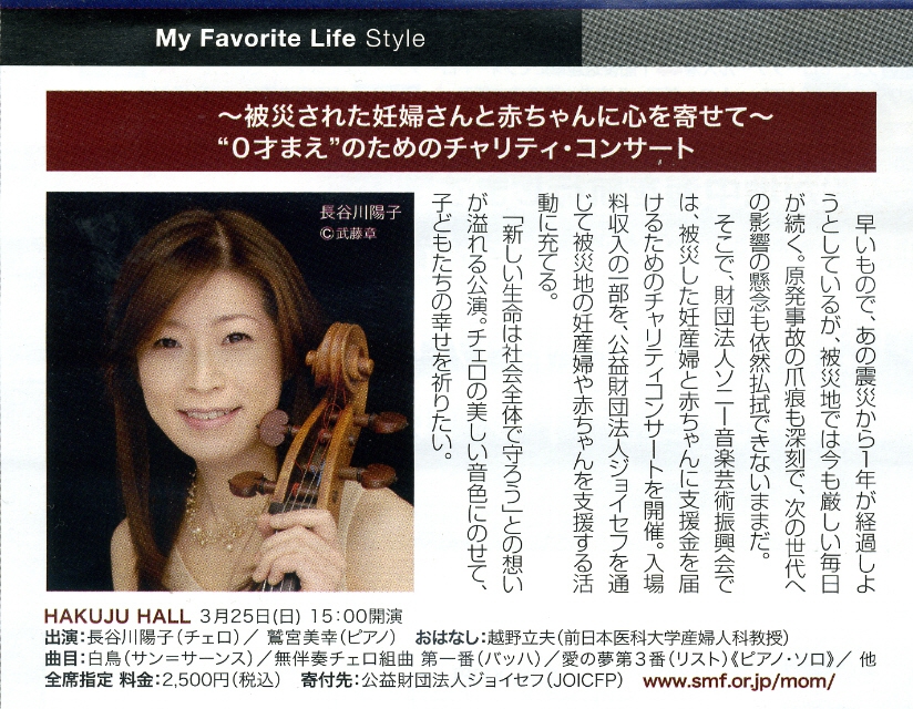 3月25日に白寿ホールで行われる“0才まえ”のためのチャリティ・コンサートの予告記事が、