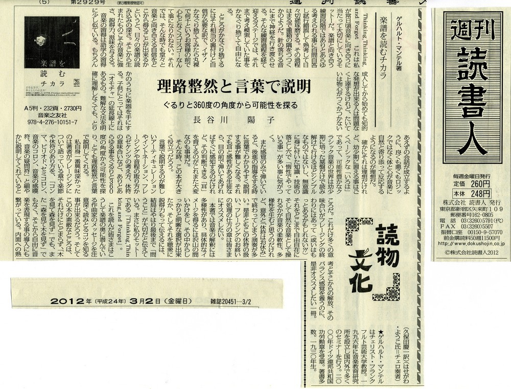 毎週金曜日に(株)読書人から発行される「週刊読書人」の3月2日号5頁に「楽譜を読むチカラ(ゲルハルト・マンテル著)音楽之友社刊」の書評が掲載されています。