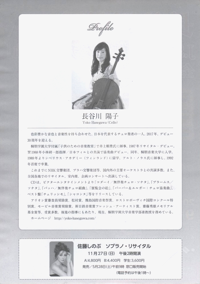 【出演】長谷川陽子(チェロ) 田中英明(ピアノ)