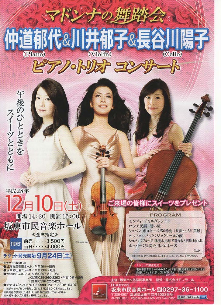 【出演】仲道郁代(Piano)、川井郁子(Violin)、長谷川陽子(Cello)