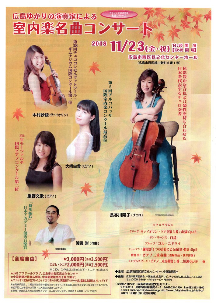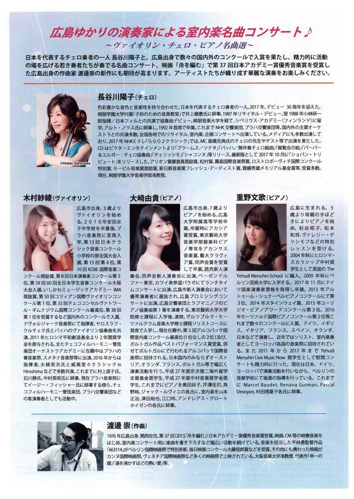 【出演】木村紗綾(ヴァイオリン)、長谷川陽子(チェロ)、大崎由貴(ピアノ)、