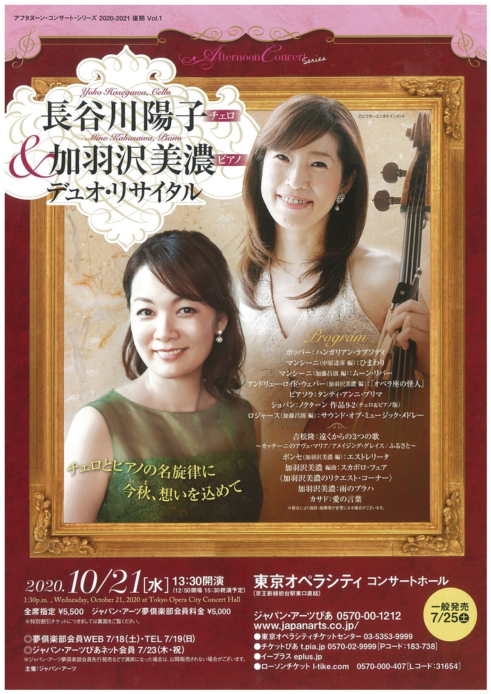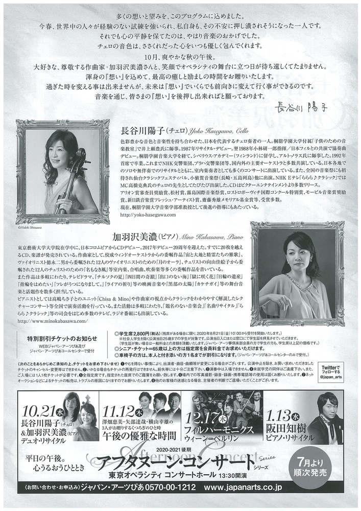 【出演】長谷川陽子(チェロ) 加羽沢美濃(ピアノ)